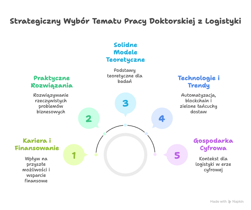 Logistyka stała się „ukrytym krwiobiegiem” gospodarki cyfrowej – od błyskawicznych dostaw e-commerce po reagowanie na zakłócenia klimatyczne. Według najnowszych raportów technologia zmienia branżę szybciej niż kiedykolwiek: automatyzacja, blockchain, drony czy zielone łańcuchy dostaw to już nie futurologia, lecz codzienność rynku (dirox.com). W rezultacie uczelnie i grantodawcy oczekują od doktorantów nie tylko solidnych modeli teoretycznych, lecz także oryginalnych i praktycznych odpowiedzi na realne problemy firm. Wybór tematu pracy doktorskiej z logistyki staje się więc decyzją strategiczną – decyduje o Twojej widoczności naukowej, szansach pozyskania finansowania i późniejszej karierze.
