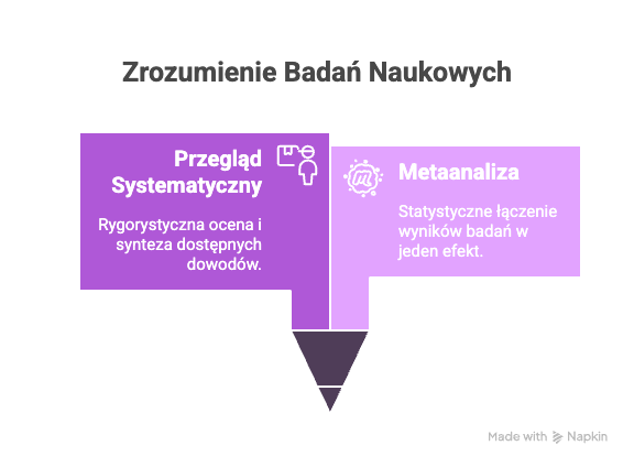 - Metaanaliza (Meta-analysis) to statystyczna metoda łączenia wyników z wielu niezależnych badań włączonych do przeglądu systematycznego. Pozwala ona na uzyskanie jednego, zbiorczego oszacowania wielkości efektu (np. skuteczności terapii, siły korelacji). Mówiąc prościej: jeśli przegląd systematyczny zbiera wszystkie puzzle (badania), to metaanaliza składa je w jeden spójny obraz, który ma znacznie większą moc statystyczną niż pojedynczy element.