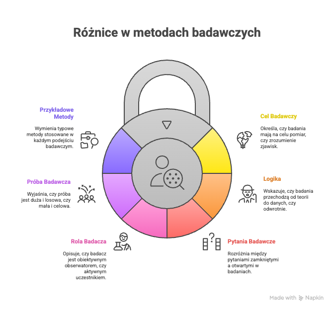 | Pytania badawcze | Zamknięte, precyzyjne, pytają o częstotliwość, siłę związku. | Otwarte, eksploracyjne, pytają o procesy, doświadczenia, znaczenia. |