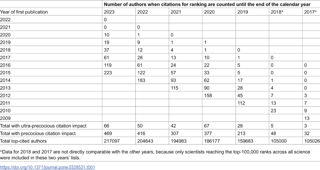 - „Przedwcześnie dojrzali” (precocious): Badacze, którzy znaleźli się w gronie najczęściej cytowanych w swojej dziedzinie w ciągu 8 lat od debiutu naukowego.